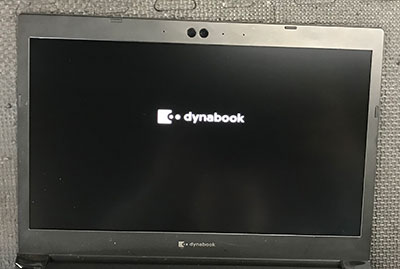 起動画面である「dynabook」のロゴ表示も不安定で、暗い部分にムラが出ていることから、液晶そのものが広範囲で損傷していることが推測されます。
