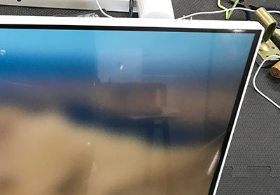 お送りいただいた写真を確認すると、画面右側を中心に明らかなヒビ割れが確認でき、表示部分にも広範囲にわたって帯状のムラが発生していました。
