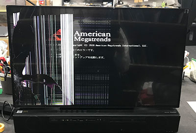 外観上は大きな変形がないように見えても、電源を入れると画面は真っ暗なままで、正常な表示が一切確認できない状態でした。