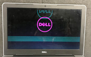 実際にお預かりしたパソコンを確認すると、起動直後のDELLロゴ画面でも横方向の帯が表示され、そのまま表示が上下に揺れるような状態でした。